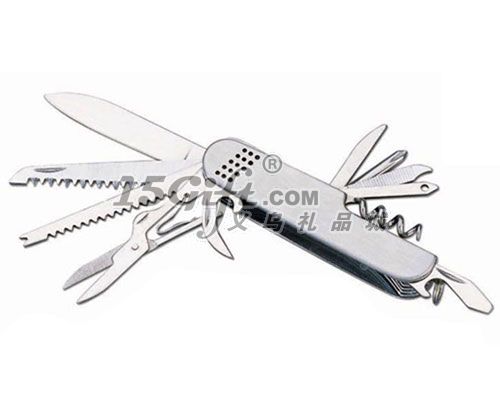 長度:8.9㎝功能:1、大刀2、小刀 3、開罐器,兼附:4、開瓶器,兼附:5、一字螺絲批6、鉆孔錐7、鑰匙環(huán)8、剪刀9、鎜刀10、指甲銼,兼附:11、 鋼鋸毛凈重:29/28(KG)包裝方式:獨(dú)立PP袋+白色紙箱240PC/CTN:包裝規(guī)格:26.5X21X34.5CM起訂量:1000把