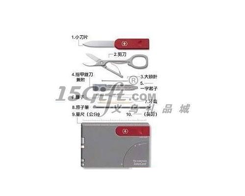 功能:1.開信刀2.剪刀3.指甲挫,兼附:4.改錐5.大頭針6.圓珠筆7.鑷子8.牙簽