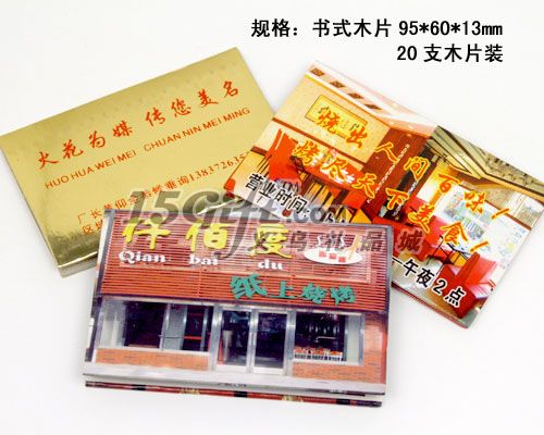 書式木片款式,造型新穎獨(dú)特,使用方便美觀,廣告位大,產(chǎn)品包裝材質(zhì)為:250g白底白紙,可做客戶專版廣告,彩色印刷,腹亮膜。里面放20片火柴梗,火柴梗長度為:50mm。