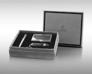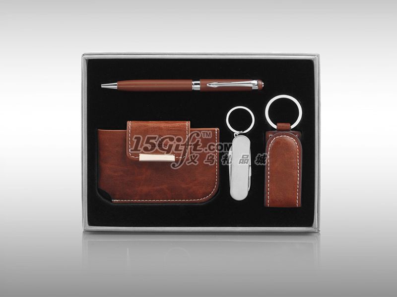 環(huán)保筆內(nèi)芯,鑰匙包油邊平整,鑰匙扣皮料手感極佳,多功能刀電鍍有光澤,手感極佳的黑色植絨吸塑,高檔灰色進(jìn)口植絨包裝紙的外盒。