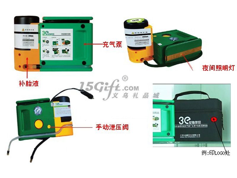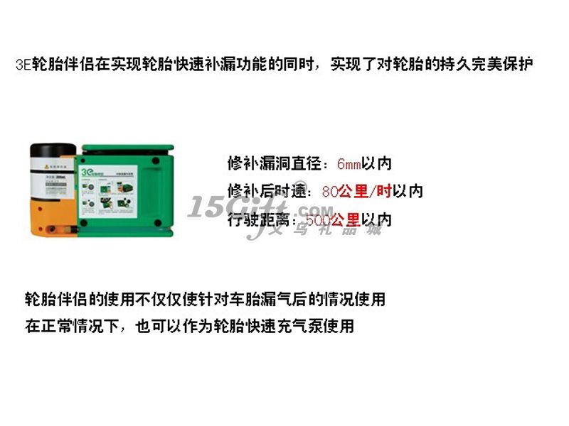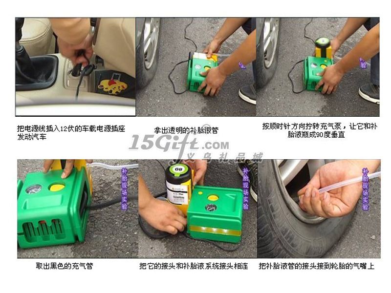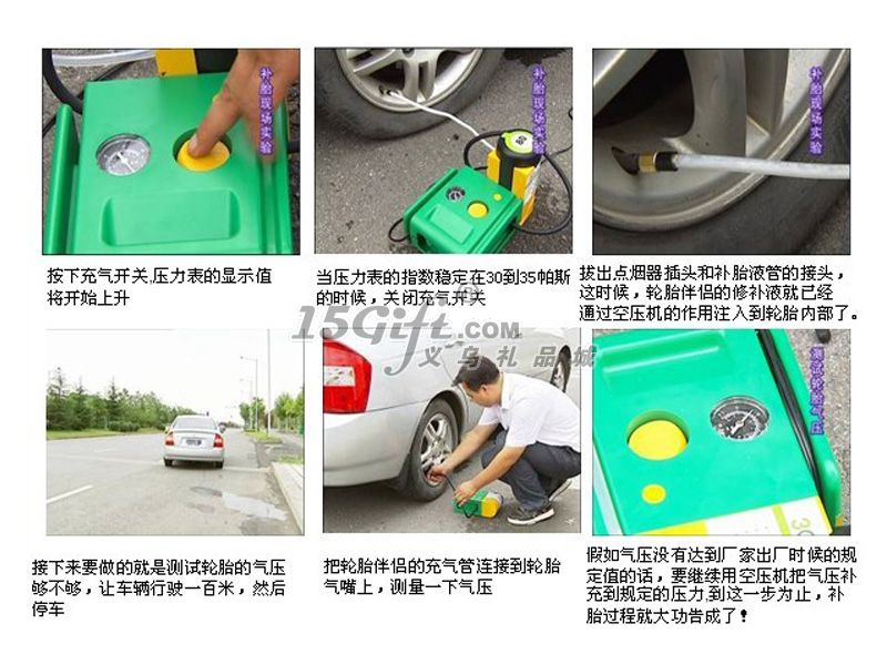 操作方法:第一步:將點煙器插頭插入12V的車載電源插座,發(fā)動汽車。第二步:1、拿出補胎液管。2、順時針方向擰轉空壓機,使其與補胎液瓶成90度垂直。3、取出充氣管,將充氣管接頭與補胎液系統(tǒng)接頭相連。3、將補胎液管接頭接至輪胎氣嘴,確保二者連接到位。第三步:1、按下開關,使之處于開啟(Ⅰ)位置,壓力表的顯示值將開始上升。在補胎液通過的過程中,壓力超過40PSI屬于正?,F(xiàn)象,當補胎液完全進入輪胎后,壓力顯示將反映實際胎壓。2、盡量確保您停機后壓力表的顯示值會穩(wěn)定于30PSI以上。警告:如果壓力表的顯示值始終無法超過20PSI,說明輪胎受損過于嚴重,采用本機無法修復,請速與專業(yè)維修店聯(lián)系。第四步:1、當壓力表穩(wěn)定于30PSI以上時,關閉空壓機。2、拔出點煙器插頭,分離補胎液管接頭,將本機重新放回原處。3、將車輛開動百米左右后,停車測量氣壓。如氣壓不夠,應將氣壓補充到汽車生產廠家規(guī)定的壓力。注意:補胎后的行駛時速不得高于80公里。