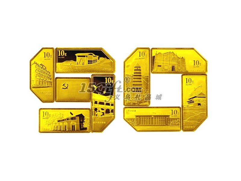 異形組合金銀條系列是中國共產(chǎn)黨建黨90周年貴金屬藏品的點睛之作,該藏品為9枚金條組合而成,每枚金條都以我黨的足跡為主題畫面。9枚金條拼在擺件上即成“90”字樣,寓意建黨90周年,歷史厚重感油然而生,僅此一個藏品即可管窺我的90年豐功偉績,堪稱我黨偉大歷程的編年史。