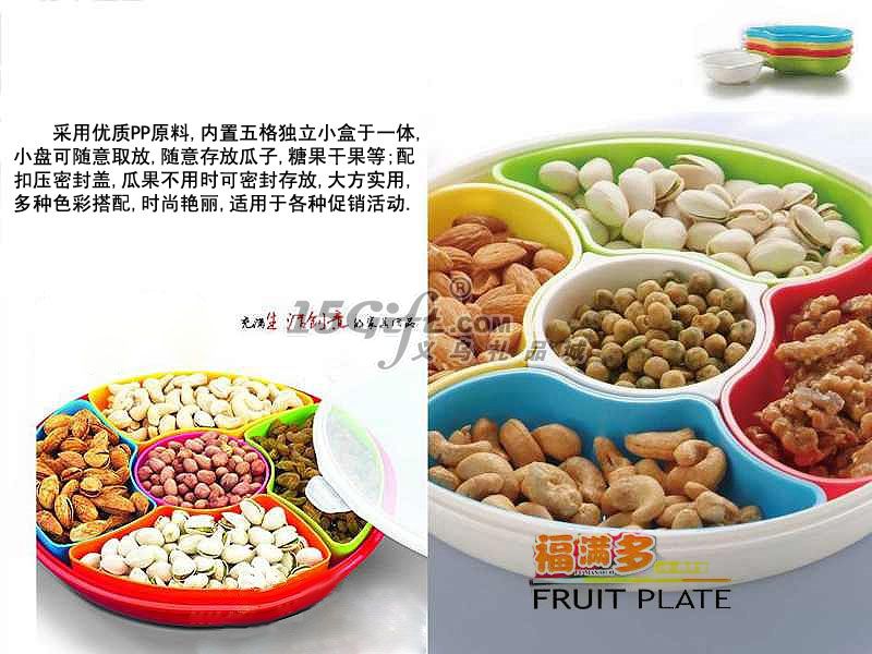 產(chǎn)品特點(diǎn):采用優(yōu)質(zhì)PP原料,內(nèi)置五格獨(dú)立小盒于一體,小盤可隨意取放,隨意存放瓜子,糖果,干果等;配扣壓密封蓋,瓜果不用時(shí)可密封存放,大方實(shí)用,多種色彩搭配,時(shí)尚艷麗,適用于各種促銷活動(dòng).