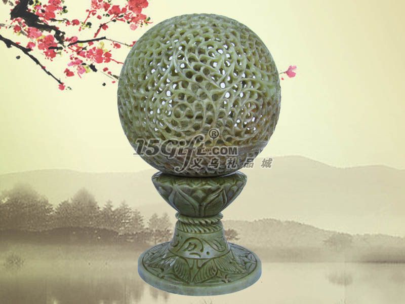相關(guān)介紹:由天然的青田石鏤空雕刻而成。最神奇的地方在于:圓球內(nèi)鏤雕有觀音菩薩座像,觀音菩薩座像是雕刻師通過圓球的孔洞往里鏤雕出來的,且圓球毫無破損之處,顯示了雕刻師精湛的技藝。圓球和底座用一根鋼軸相連,用手撥動圓球可以順暢地轉(zhuǎn)動,十分形象的體現(xiàn)了時來運轉(zhuǎn)的寓意,也顯示了這款時來運轉(zhuǎn)擺件的送禮、收藏價值。